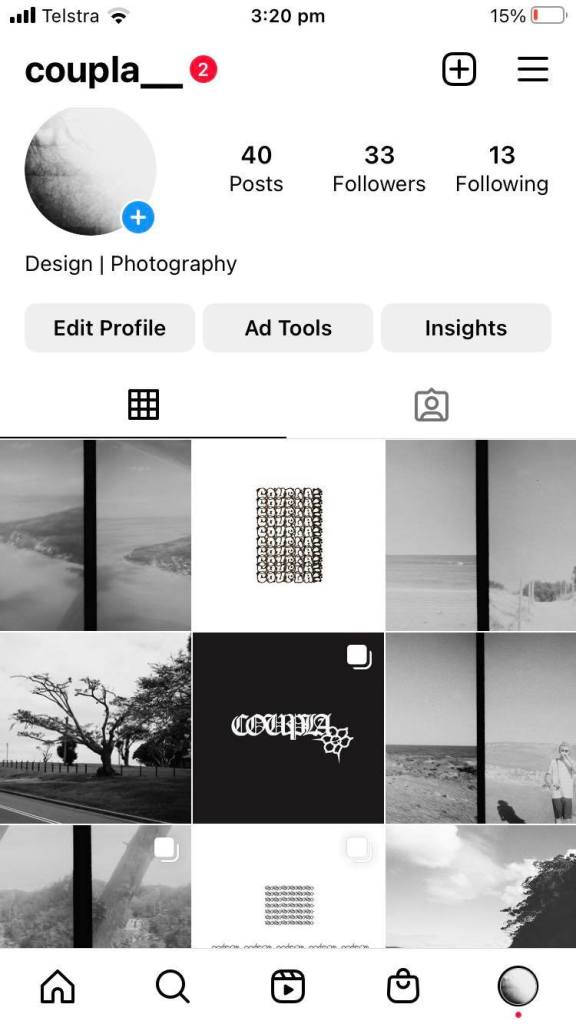 The first iteration to this digital artefact took place at the very beginning, as Coupla is actually a recreation from my previous artefact Couplablokes. This iteration was made due to myself wanting to redesign the pages theme and utility to now align with its current purpose of including graphic design pieces and more selective imagery, moving away from colour to predominately posting black and white.
