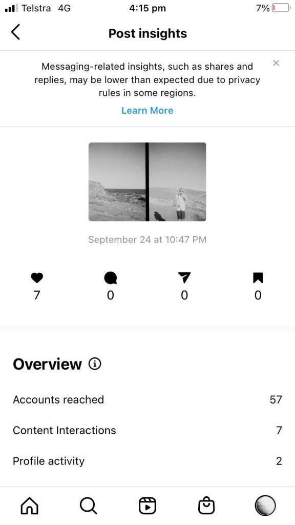 The iteration that were made to the artefacts imagery based content come from the analytics from the page prior, that showcased that the black and white photos that were uploaded received more interaction and engagement then ones with colour. The another iteration based around the page now including graphic design works come from trying to evolve the artefacts value creatively and broader its reach towards a community that is not only interested in photography. From this progression of the page I learnt the importance of the need to always refine and evolve your artefact to make it align with its value and utility