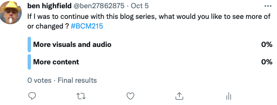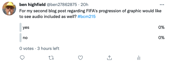 Another iteration that was made to my DA, was created due to audience interaction, where for the first blog post I was left feeling underwhelmed, this provided me with the opportunity to identify areas for progression and make some early iterations. With many blogs and online articles offering audio options as well, my first post did not despite offering visuals and in-text links it was also four minutes to read in total, which I felt may have deterred potential readers from visiting the article. To see if my audience would prefer audio for the next post, I decided to create a poll through my twitter account which had also been promoting the series and providing updates.