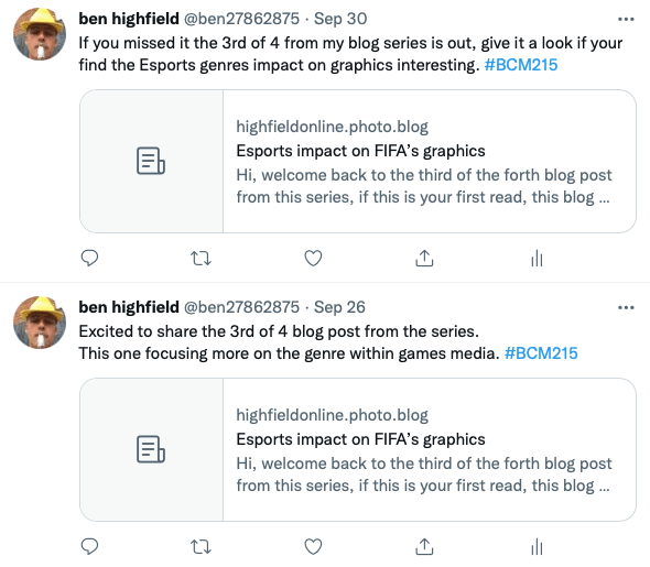 Another change I made throughout the creation of my artefact, came after the second blog post of the series, another iteration to the artefact felt necessary due to the feeling that my reach was still not were it could be. The next change I made to the artefact was centred around its promotion with both blogs one and two only being shared on my twitter account once. I decided to increase the sharing of the blogs three and four to twice in order to increase its reach.